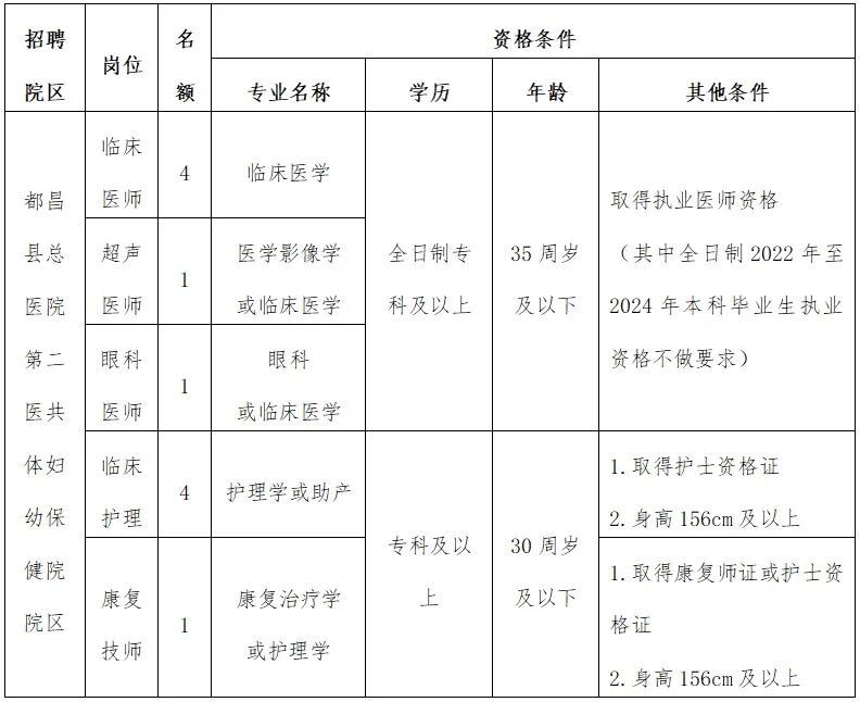 为进一步加强我县医疗卫生单位人才队伍建设,根据业务发展需要,都昌县总医院拟面向社会公开招聘聘用制工作人员,现公告如下:2.遵守宪法和法律,拥护中国共产党的领导和社会主义制度;4.具有岗位所需的任职资格、职业资格、技能要求和身体条件;6.报考人员须年满18周岁,且不超过岗位表中注明的年龄上限。岗位条件的年龄要求,统一计算为18 周岁以上(2006年5月28日以前出生),30周岁及以下(1993年5月28日以后出生),35周岁及以下(1988年5月28日以后出生)。此年龄计算方法适用于本次考试所有环节。3.涉嫌违法违纪正在接受审查的人员和尚未解除党纪、政务等处分的人员;4.在各级公务员、事业单位考试和法律规定的其他国家考试中被认定有严重违纪违规行为尚在禁考期内的人员;7.在读的普通高校全日制非2024届毕业生(在读的全日制非2024届研究生不能以本科及以下学历报考);坚持德才兼备的用人标准和“公开、公平、竞争、择优”的原则,按照“资格准入、公开招聘、考试考核、择优聘用”的方法,通过考试、考核后择优聘用。(一)报名时间:从公告发布之日起至2024年6月7日17:00。现场报名地址:都昌县总医院三楼人力资源部(都昌县广苑路2号);报名邮箱:dcwsj@126.com。(三)咨询电话:0792-5580188 15007026999(一)资格审查:报考人员持本人身份证、毕业证、学位证、学历认证材料(应届生需提供学籍在线验证报告、已获学历的提供学历注册备案表)、资格证进行资格审查。审查时间:2024年6月12-13日。审查地点:都昌县总医院三楼人力资源部。(2)时间地点:2024年6月22日,考试地点另行通知。(3)考试方式:采取“笔试+面试”相结合方式进行(其中取得学士学位全日制本科临床医学生不需笔试,只需参加面试),总分均为100分。①采取“笔试+面试”相结合方式的。笔试总分100分,占总成绩的50%;面试总分100分,占总成绩的50%。总成绩=笔试成绩×(50÷笔试总分)+面试成绩×(50÷面试总分)。②仅采取面试进行的:总分100分,面试成绩即为最终总成绩。参加笔试人员,基础理论及专业知识考试完成后,按招聘名额1:2的比例进入面试,若未达到1:2比例,则全部进入面试,统一安排面试时间。(四)录取方法:总分100分,按总成绩高低排名,顺序录取,总成绩相同者以笔试成绩高者排前。1.本次招聘实行诚信报名、诚信审查制度,贯穿招聘录用全过程,如有不实,成绩一律无效。2.考生在接到录取通知2天内到医院做健康体检,体检不合格者不予聘用,由此出现缺额的,按总成绩排名顺序依次递补;自入职起三个月内,如有辞职等情况,根据医院临床工作需求,按本次招聘总成绩排名顺序依次递补;3.护理人员录取排名最后一位需下乡至第二医共体乡镇卫生院锻炼一年,因此原因放弃者,按顺序递补。4.实行“公示”制度,公示聘用人数、入围名单、成绩单、聘用名单。5.工资待遇按照都昌县总院第二医共体妇幼保健院合同制聘用人员工资待遇规定执行。
