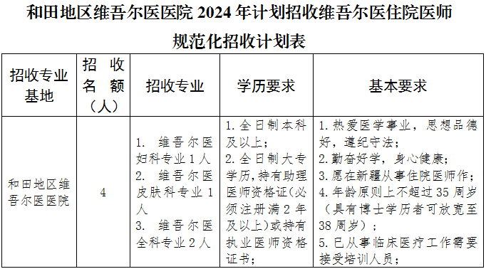 拟从事临床医疗工作的全日制医学专业本科及以上学历的应届、往届毕业生,或已从事临床 (含中医维吾尔医 )医疗工作需要接受培训的人员。按招收对象来源分为非基地医院托培养的单位人、尚未就业自愿接受住培的社会人。非基地医疗机构可根据本单位实际情况选派单位人参加培训。4.年龄原则上不超过35岁(具有博士学历者可放宽至38周岁);5.学历要求:全日制本科及以上学历,或全日制大专学历,持有助理医师资格证(必须注册满2年及以上)或持有执业医师资格证书。2.处于培训期间的住院医师,包括因各种原因尚在延长培训期的住培医师;3.被住培基地录取后无故不报到或者报到后无故自行退出不满三年者。(一)和田地区维吾尔医医院2024年面向社会公开招收中医住院医师规范化培训学员4人。详见招收计划表: