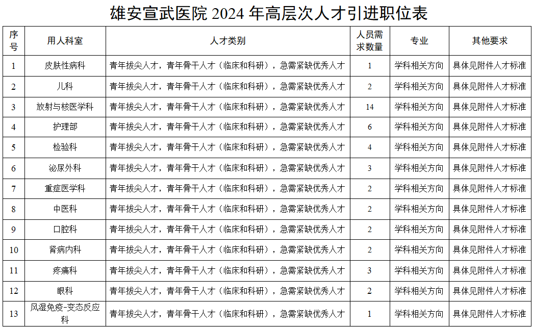 5.符合招聘岗位要求的其他条件(详见附件2《雄安宣武医院高层次人才引进标准》);