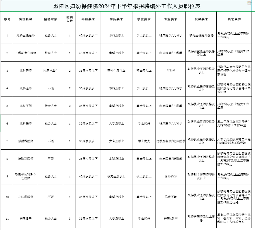 本次公开招聘聘用制招聘岗位详见《惠阳区妇幼保健院2024年下半年拟招聘编外工作人员职位表》(附件1)。